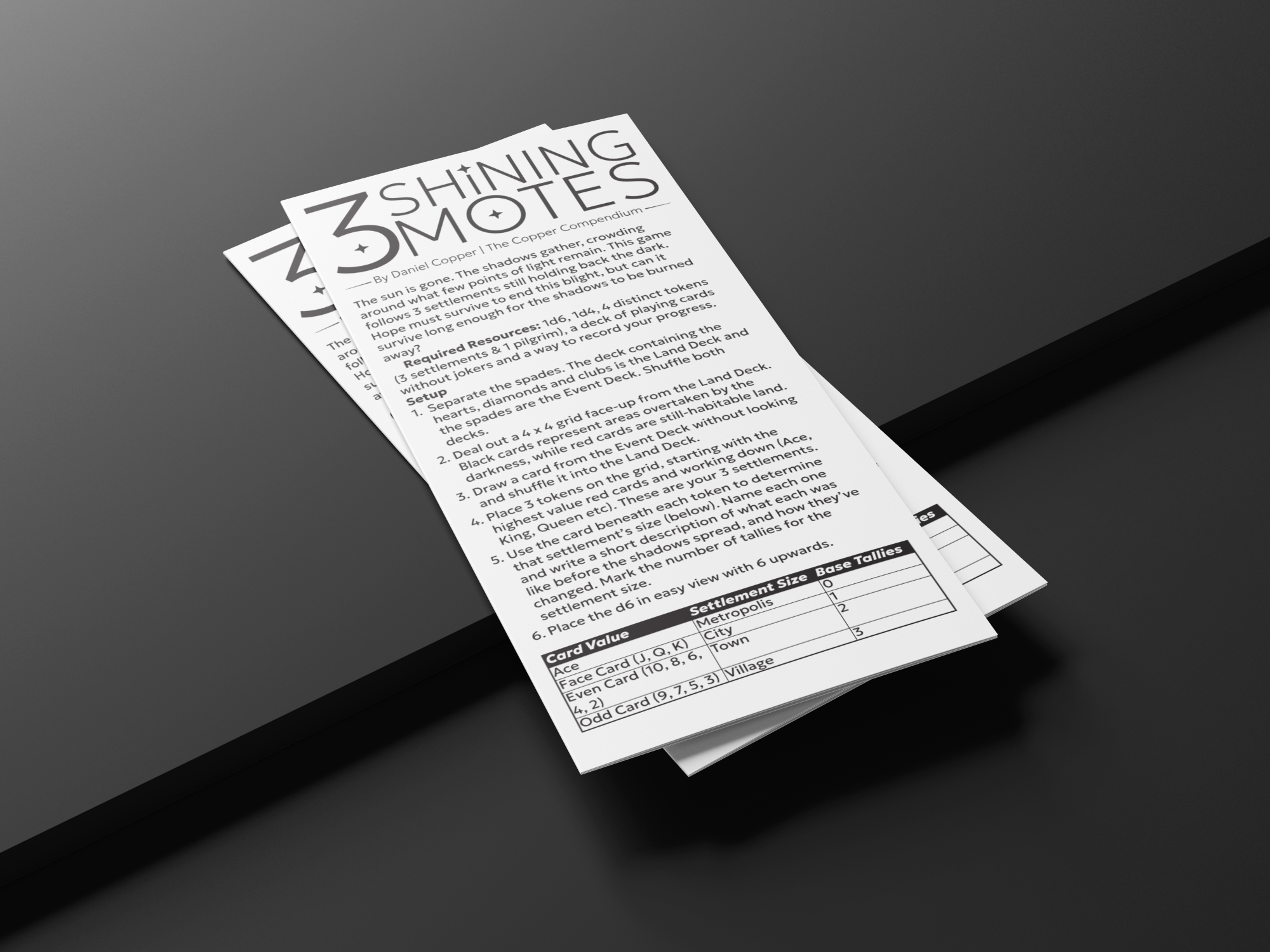 3 Shining Motes is a single-player journaling game, played with a deck of playing cards, a 4-sided die, a 6-sided die, 4 tokens and whatever method you choose to record the events that unfold. A game takes approximately an hour to play. Each turn you'll answer a prompt, either a disaster within one of your settlements or a reason for hope, then watch the shadows spread. Hope will prevail, eventually, if even one settlement survives the tide of darkness.